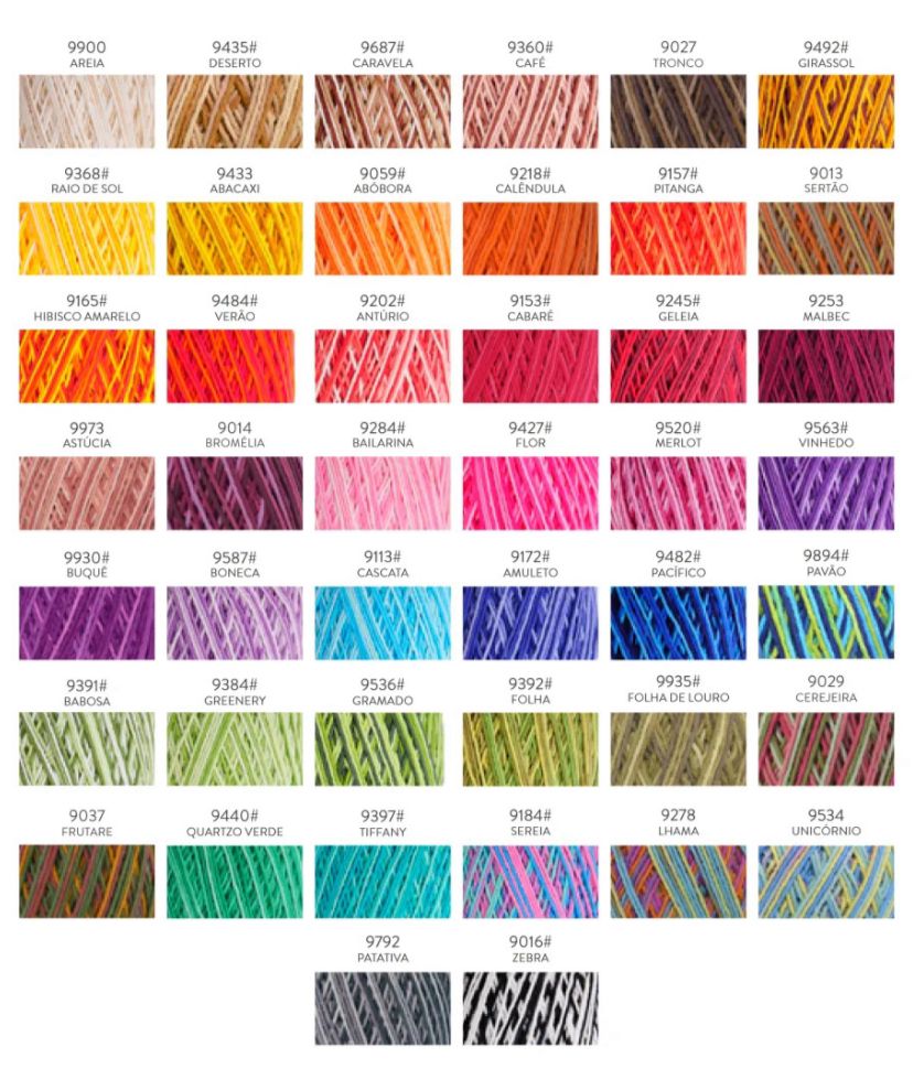 9013-Sertão, 9014-Bromélia, 9016-Zebra, 9027-Tronco, 9029-Cerejeira, 9037-Frutare, 9059-Abóbora, 9113-Cascata, 9153-Cabaré, 9157-Pitanga, 9165-Hibisco Amarelo, 9172-Amuleto, 9184-Sereia, 9202-Antúrio, 9218-Calêndula, 9245-Geleia, 9253-Malbec, 9284-Bailarina, 9360-Café, 9368-Raio de Sol, 9384-Greenery, 9391-Babosa, 9392-Folha, 9397-Tiffany, 9427-Flor, 9433-Abacaxi, 9435-Deserto, 9440-Quartzo Verde, 9482, 9484-Verão, 9492-Girassol, 9502-Merlot, 9536-Gramado, 9563-Vinhedo, 9587-Boneca, 9687-Caravela, 9792-Patativa, 9894-Pavão, 9900-Areia, 9930-Buquê, 9935-Folha de Louro, 9973-Astúcia, Pacífico, 9278-Lhama, 9534-Unicórnio